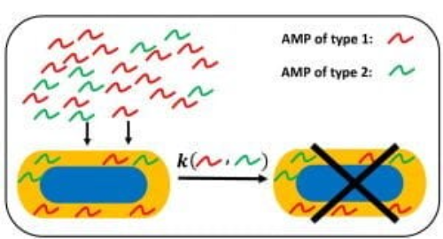 The emergence of multidrug-resistant bacteria and limitations in the number of bacterial targets remain among the main challenges in discovering new antibacterial therapies. Antimicrobial peptides (AMPs) are compounds naturally produced during immune responses of living organisms against bacterial infections, making them a strong alternative to conventional antibiotics. We study the activity of antimicrobial peptides, both in combination and alone, against bacteria using first-passage stochastic methods, Monte-Carlo simulations as well as mean-field descriptions.